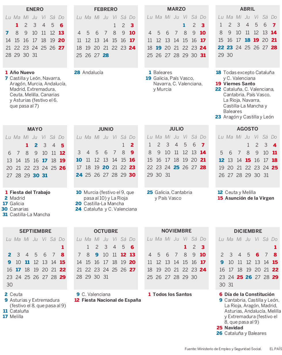 En total, el año que viene habrá ocho días de fiesta comunes a toda España: Año Nuevo, Viernes Santo (19 de abril), Primero de Mayo, 15 de agosto, 12 de octubre, 1 de noviembre, 6 de diciembre y el día de Navidad. Esta es una de las cifras más bajas que permite el calendario y sucede porque otros dos festivos comunes, el Día de Reyes y el 8 de diciembre, caen en domingo.