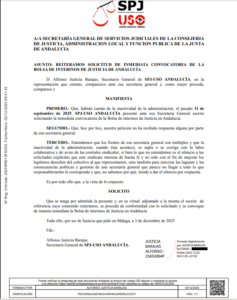 PRIMERO.- Que, habida cuenta de la inactividad de la administración, el pasado 11 de septiembre de 2025, SPJ-USO ANDALUCÍA presentó ante esa Secretaría General escrito solicitando la inmediata convocatoria de la Bolsa de interinos de Justicia en Andalucía.