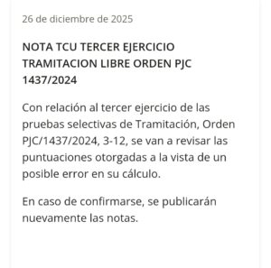«Con relación al tercer ejercicio de las pruebas selectivas de Tramitación, Orden PJC/1437/2024, 3-12, se van a revisar las puntuaciones otorgadas a la vista de un posible error en su cálculo.