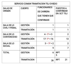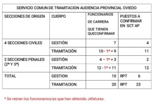 Os adjuntamos cuadro de la Oficina Judicial de Oviedo. (Datos obtenidos de las RPT publicadas, de la proporcionalidad establecida por la Viceconsejería de Justicia y de la relación de personal publicada en el Tablón de Anuncios el día 10/02/2026).