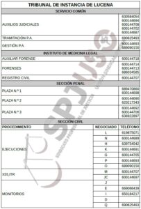 Constando que en el Partido Judicial de Lucena existe una especial dificultad para contactar telefónicamente por parte de las distintas OOJJs, profesionales y público en general, por este sindicato se ha gestionado una relación telefónica provisional que sirva de ayuda